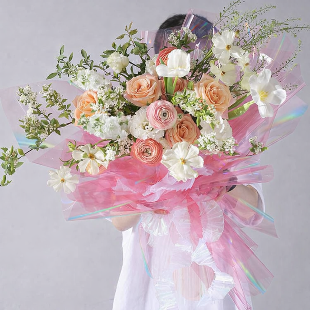 Folia florystyczna opalizująca typu holograficznego, wykonana z cienkiego i elastycznego materiału, przeznaczona do pakowania bukietów, flower boxów oraz nowoczesnych kompozycji florystycznych.
